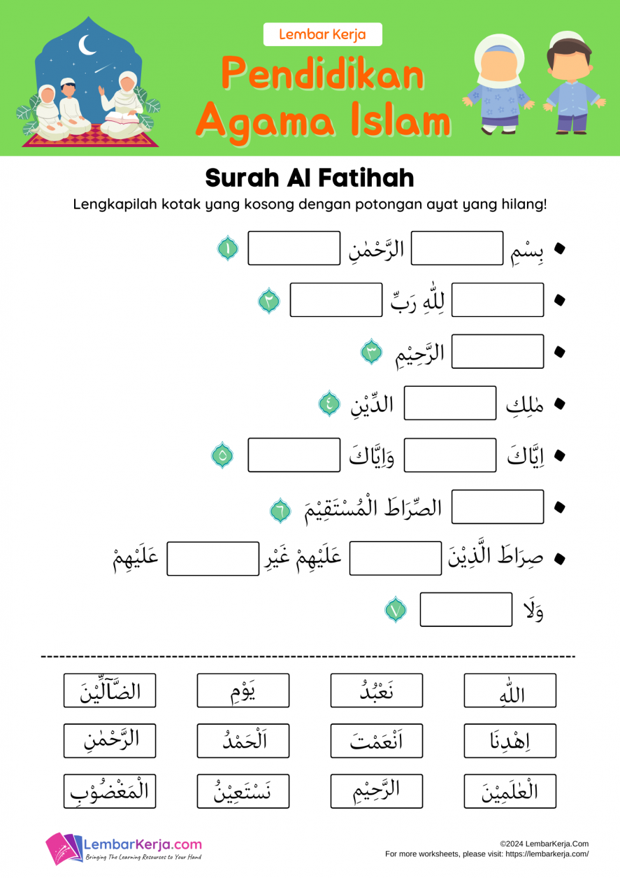 Pada bab pertama dalam pelajaran Pendidikan Agama Islam dan Budi Pekerti untuk kelas 1 SD, murid akan mempelajari tentang Aku Cinta Al-Qur’an, di mana salah satu sub-babnya adalah tentang Surah Al-Fatihah. Lembar kerja berikut adalah untuk melatih kemmapuan dan hafalan siswa dalam mengurutkan dan menyambung ayat dari surah Al-Fatihah.