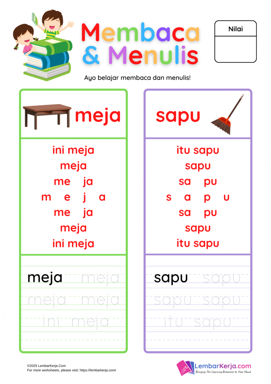 Lembar kerja selanjutnya masih tentang membaca dan menulis dua suku kata tanpa huruf mati. Kali ini kosakata yang diperkenalkan adalah meja, sapu, paku, dan palu. Orang tua dapat membantu anak dalam mengeja kata yang harus dibaca. Selanjutnya, anak diminta untuk mengulangi dan menuliskan kata pada kolom yang telah disediakan.