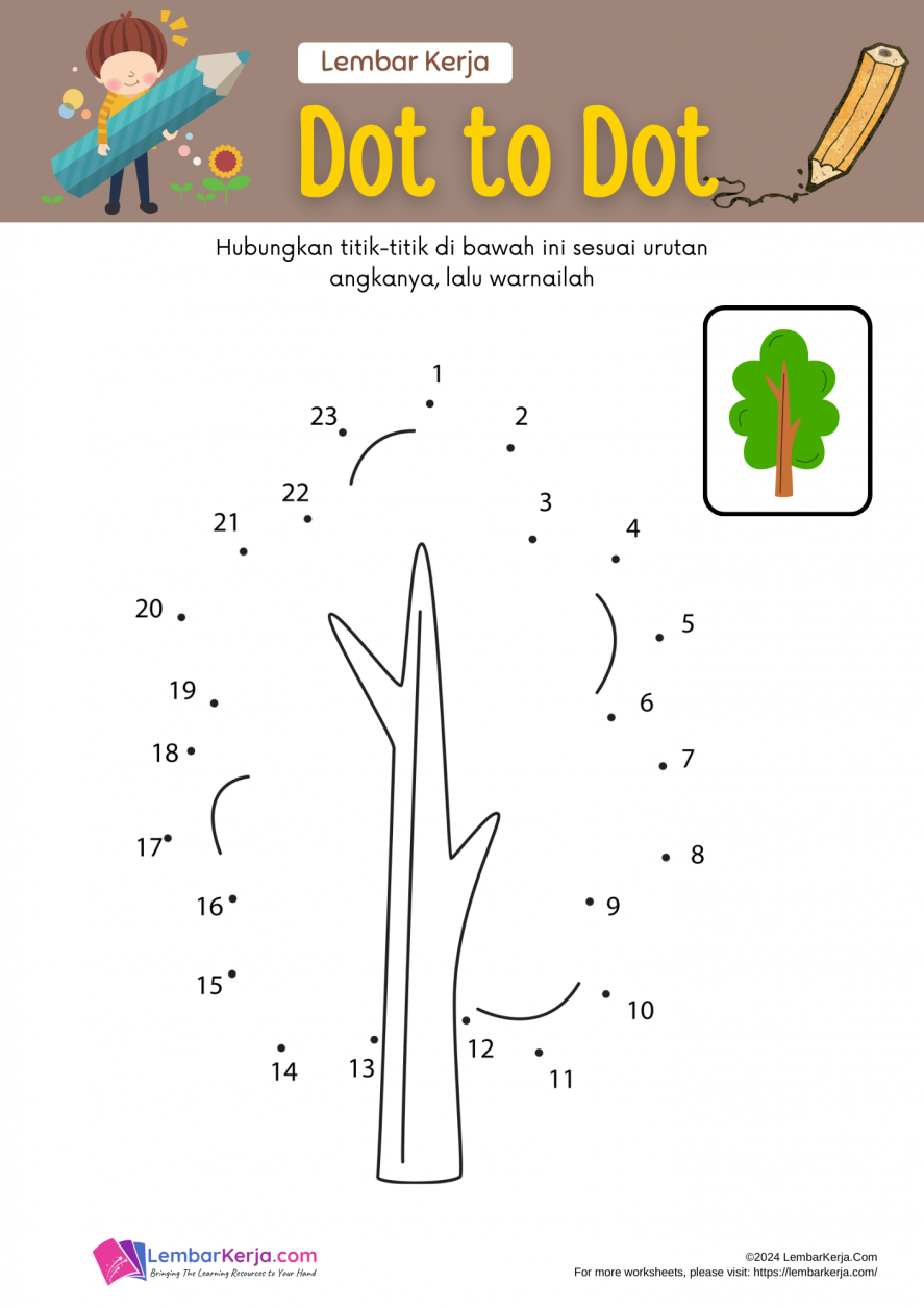 Apakah kalian suka menggambar dan mewarnai? Ayo belajar menggambar pohon dengan bantuan titik-titik. Dalam lembar kerja ini, kalian akan diminta untuk menghubungkan setiap titik sesuai urutan angkanya sampai terbentuk bambar yang utuh seperti contoh. Dan agar gambarnya menjadi lebih indah, kalian dapat mewarnainya.