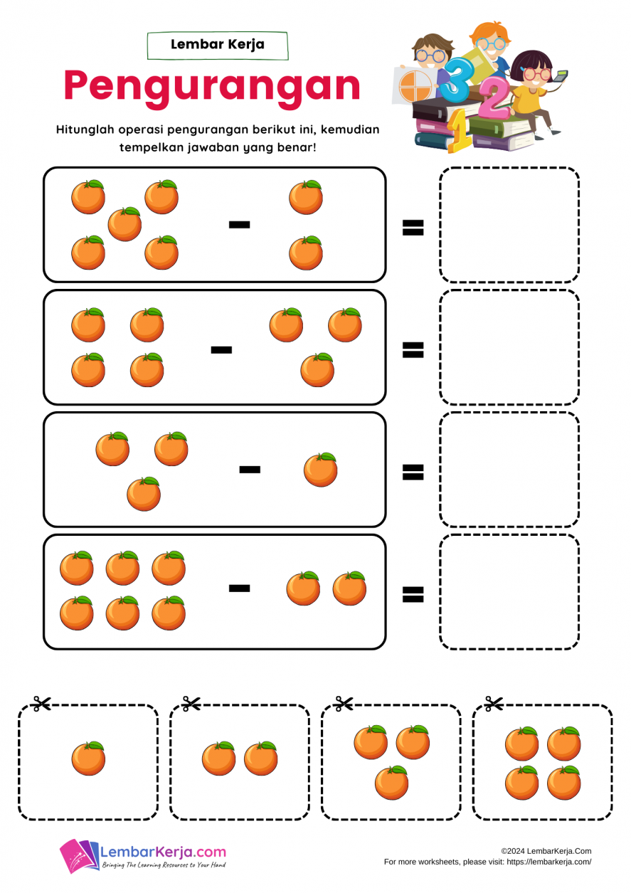 Anak bisa mulai diperkenalkan dengan pengurangan sejak usia prasekolah (3-4 tahun) secara sederhana, dan mulai benar-benar memahami serta mengerjakannya secara formal pada usia sekitar 6 tahun. Agar anak tertarik belajar pengurangan, penting untuk menjadikan proses belajar menyenangkan, interaktif, dan relevan dengan dunia mereka. Misalnya, dengan benda konkret, permainan, atau worksheet dengan gambar-gambar menarik.