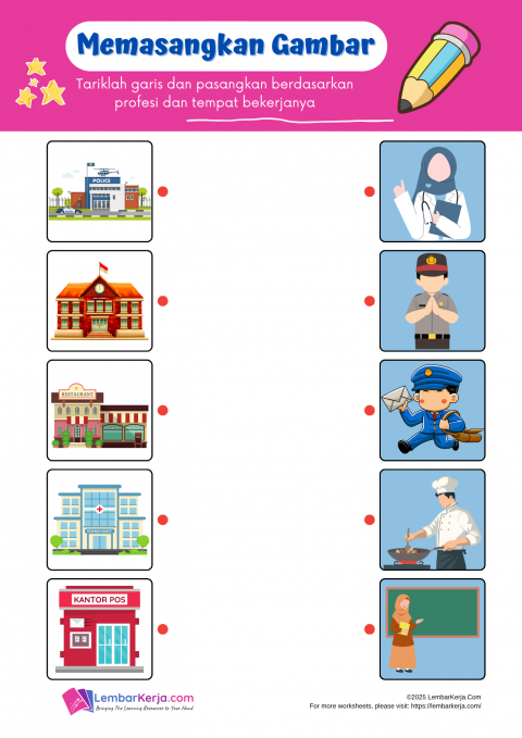 Pada lembar aktivitas ini, mintalah anak-anak untuk memasangkan gambar tempat bekerja dengan profesi pekerjaan terkait. Lembar kerja ini bertujuan untuk…